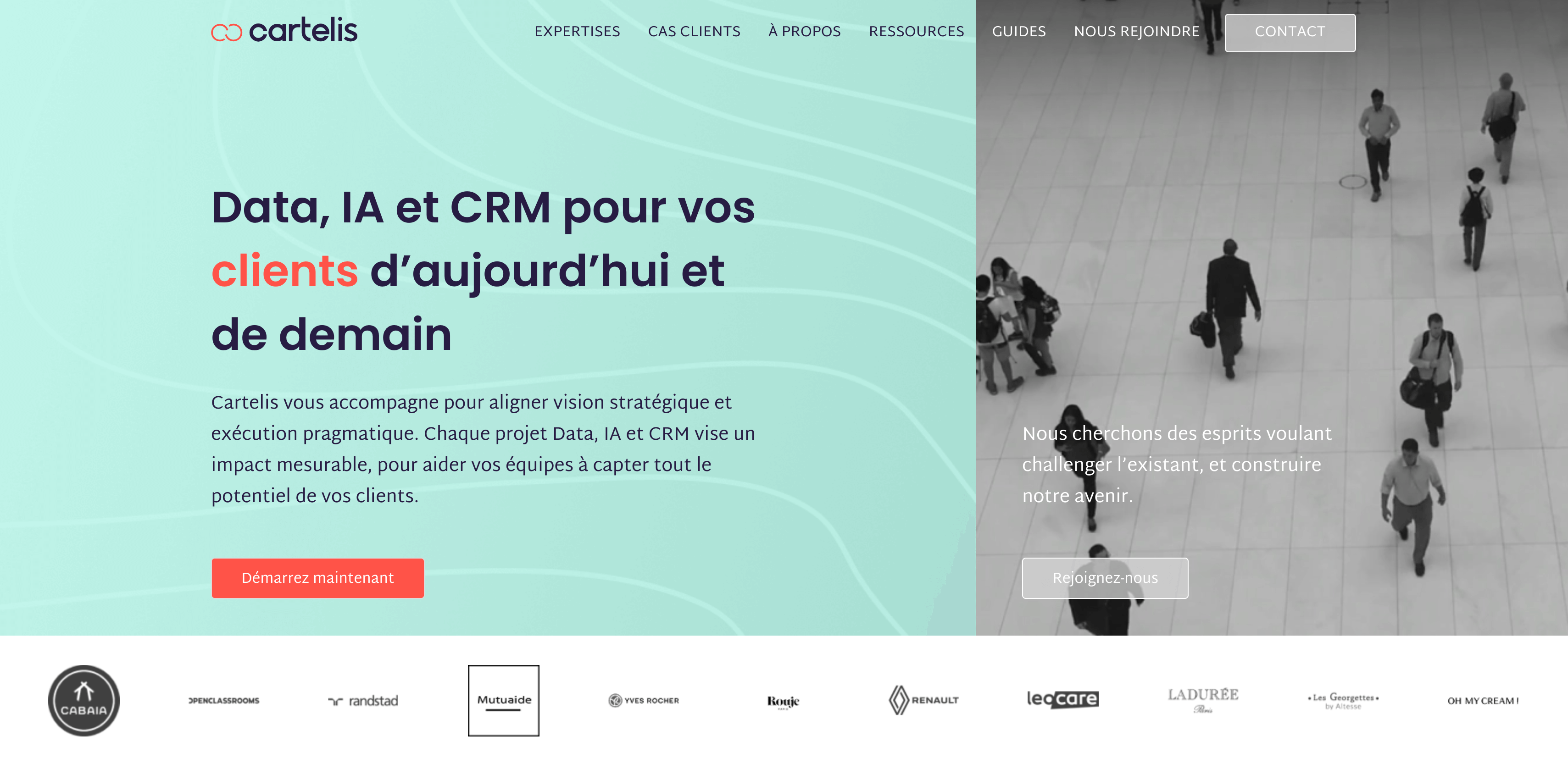 Avec la forte conviction que la pérennité des résultats nécessite de placer la data au cœur des cas d'usage, Cartelis accompagne plus d’une centaine d’entreprises (B2C & B2B, de la startup au grand groupe) dans l'optimisation de leurs processus Marketing, Sales et Customer Success.