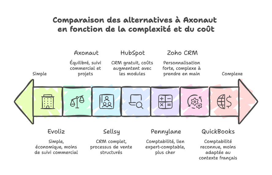 Sellsy est une alternative française plus complète pour les PME en croissance. Pipedrive est plus puissant sur le CRM pur. Pour les TPE, Henrri ou Facture.net sont des options plus légères. Axonaut reste excellent pour son rapport fonctionnalités/prix.