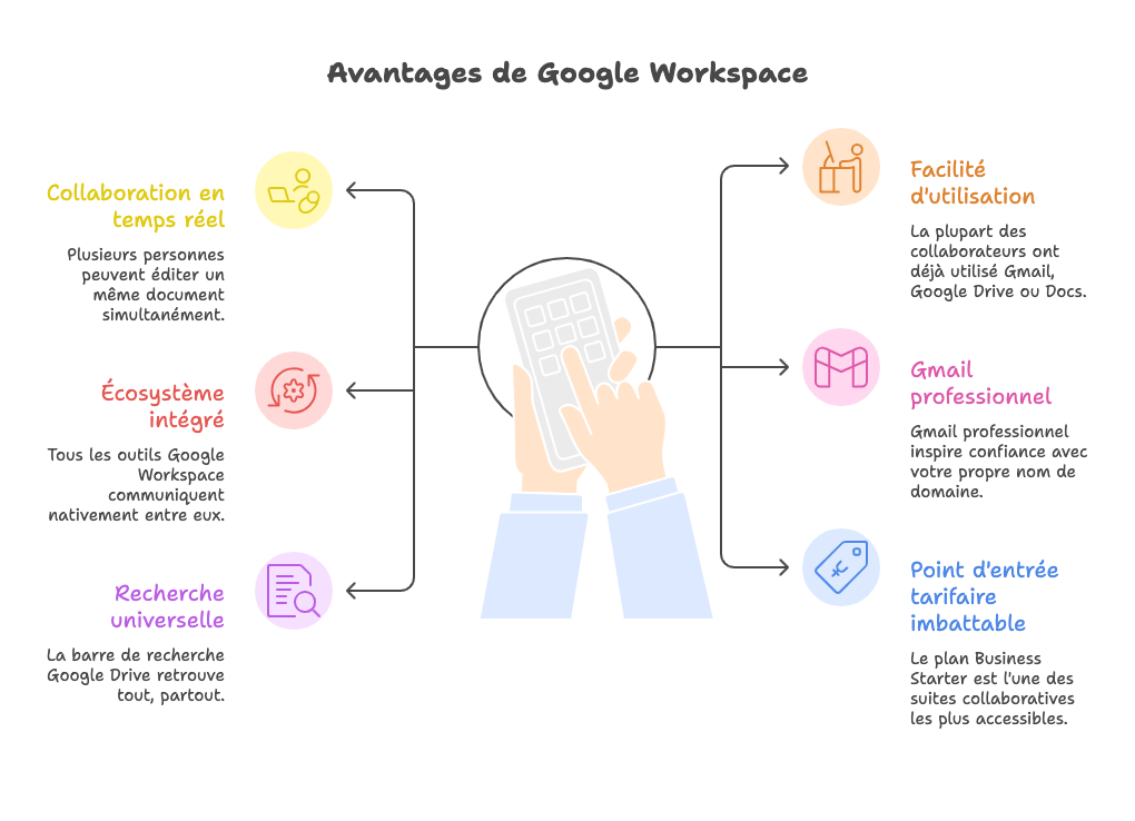Google Workspace est une suite collaborative cloud qui regroupe messagerie professionnelle, bureautique en ligne et outils de communication. Tout fonctionne dans le navigateur, sans installation, avec une philosophie claire : plusieurs personnes peuvent travailler sur le même document en même temps.