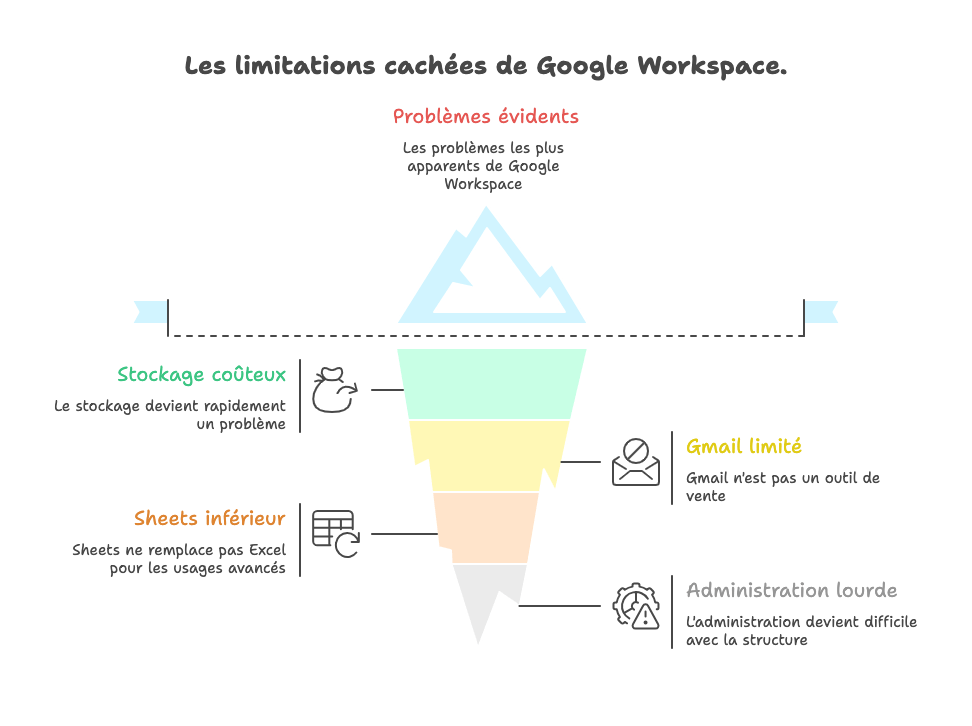 Le problème principal : le stockage est mutualisé entre Gmail, Drive et Google Photos. Quand un collaborateur accumule des années d'emails avec pièces jointes volumineuses, filme des démos produit en 4K, ou stocke des fichiers de travail volumineux (CAO, vidéos, designs), ces 2 To fondent comme neige au soleil.