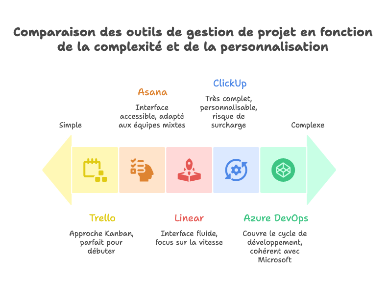 Azure DevOps (Microsoft) : La solution Microsoft couvre tout le cycle de développement : repos Git, CI/CD, tests, suivi des tâches. Idéal si vous êtes déjà dans l'écosystème Microsoft (Azure, Teams, etc.). Plus technique que Jira, mais très cohérent si vous faites du dev. À partir de 6 €/mois/utilisateur.