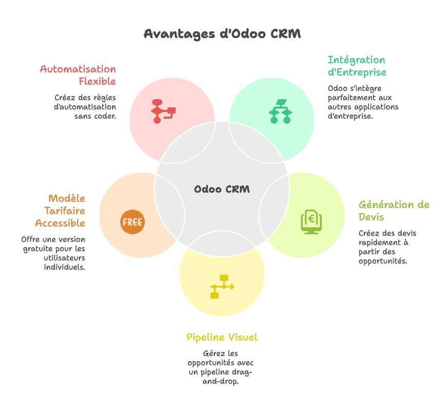Odoo CRM est un module de gestion commerciale qui permet de suivre les opportunités, qualifier les leads et automatiser les relances. Il fait partie d'une suite modulaire : on peut démarrer avec le CRM seul, puis ajouter la facturation, les stocks ou la comptabilité au fur et à mesure.