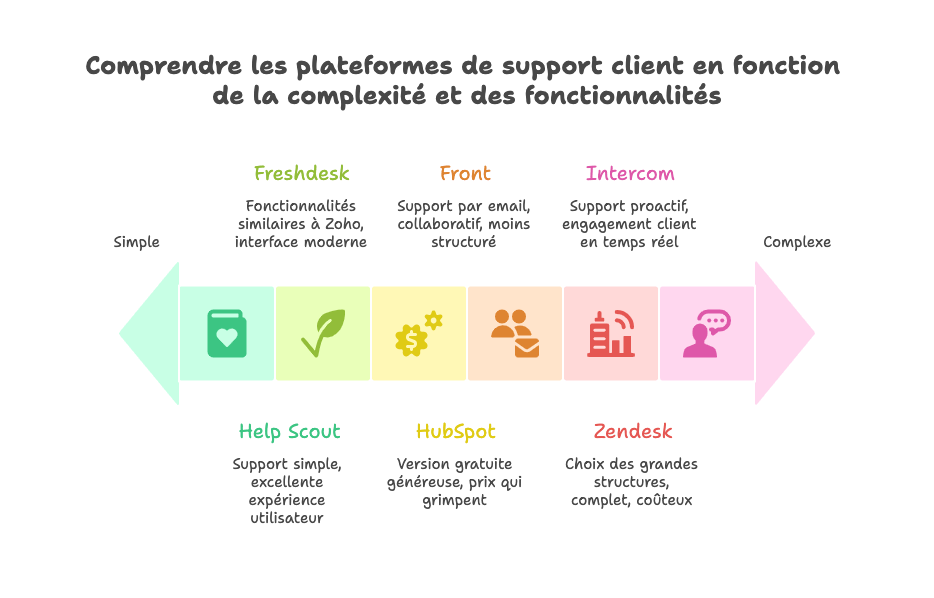 En résumé : Zoho Desk offre un bon rapport qualité/prix jusqu'à Professional. Enterprise est réservé aux structures avec besoins spécifiques (multimarque, IA poussée). Si vous êtes déjà client Zoho, c'est un choix logique. Si vous partez de zéro, comparez bien avec Freshdesk ou HubSpot selon vos canaux prioritaires (téléphonie, email, tchat).