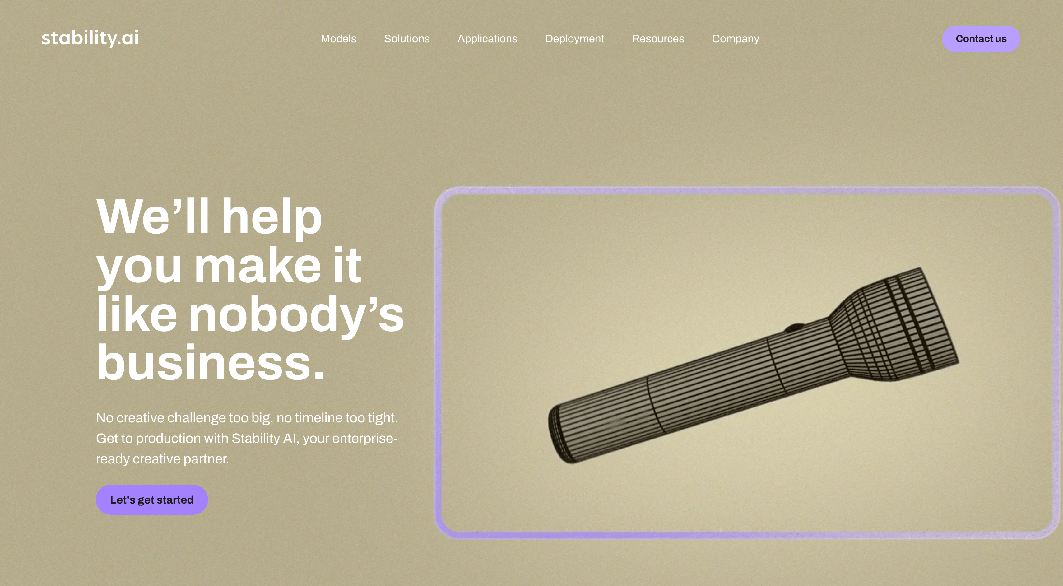 Stability AI est l’éditeur derrière Stable Diffusion, l’un des modèles d’IA générative d’images les plus puissants et largement adoptés dans le monde professionnel. Contrairement à ChatGPT ou MidJourney, qui s’adressent aussi aux particuliers et créateurs indépendants, Stability AI propose des solutions conçues avant tout pour les entreprises. Ici, pas d’inscription simple ou d’interface prête à l’emploi : pour bénéficier des services de Stability AI, il faut généralement entrer en contact avec un commercial afin de définir un contrat adapté aux besoins (publicité, e-commerce, médias, design produit, etc.).