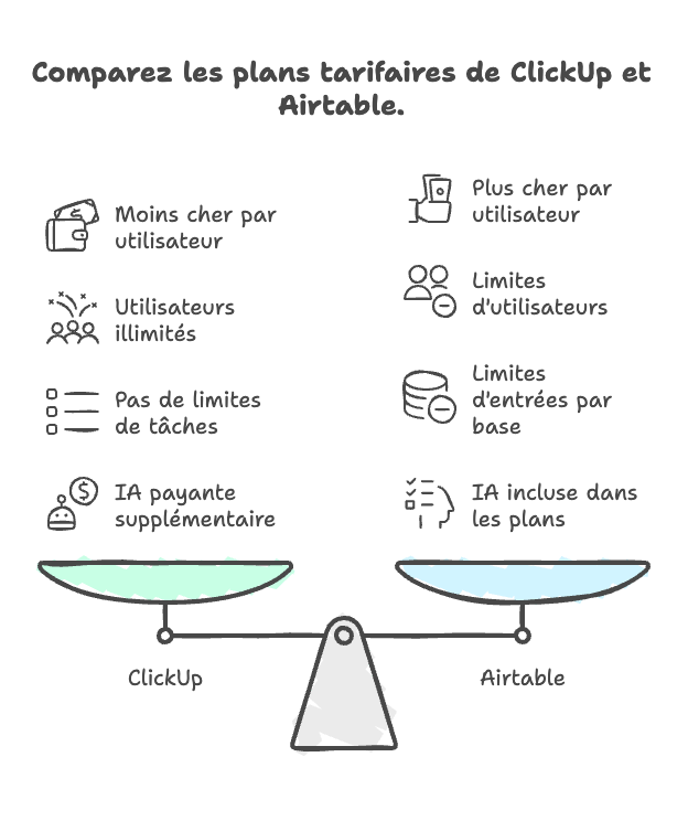 L'IA représente un coût supplémentaire sur les deux outils. ClickUp propose Brain AI à partir de 9 € par utilisateur et par mois, avec un système de crédits pour les fonctionnalités avancées. Airtable inclut des crédits d'IA dans ses plans payants, mais propose également des packs supplémentaires payants.