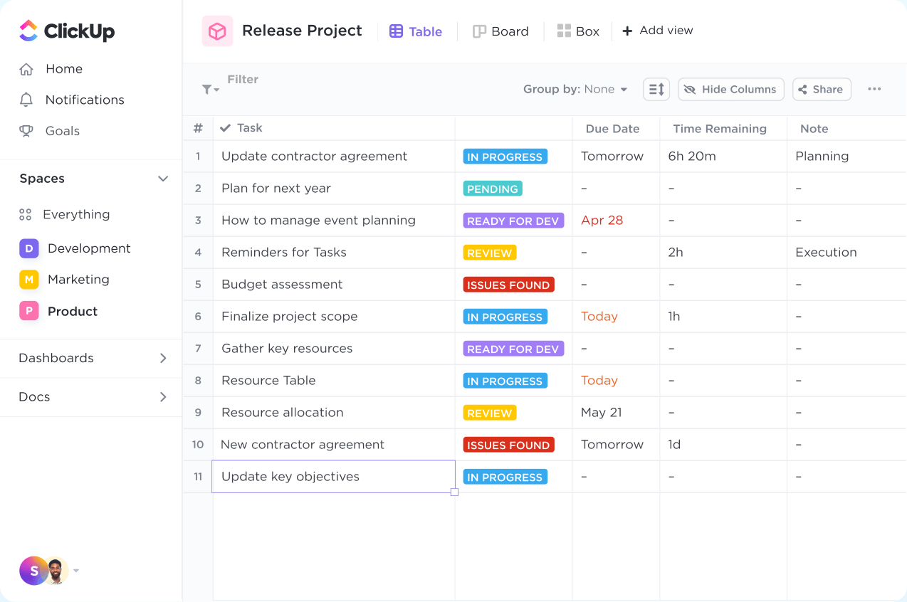ClickUp est un outil tout-en-un conçu pour remplacer l'ensemble de votre stack logicielle. Il concentre gestion de projet, documentation, objectifs, time tracking, CRM et bien plus dans une seule interface. Extrêmement flexible et personnalisable, il s'adapte à presque tous les cas d'usage mais demande un investissement en configuration. C'est l'outil que l'on choisit quand on veut tout centraliser dans une seule plateforme.