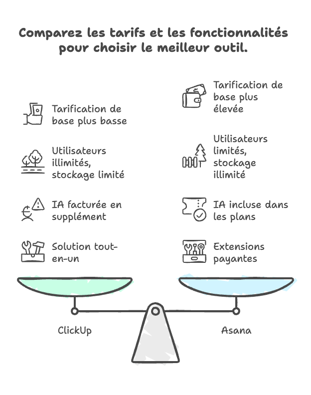 ClickUp conserve un avantage prix net, à condition de maîtriser les options IA et de vérifier que vous exploitez ses nombreuses fonctionnalités. Asana coûte plus cher, mais intègre l'IA dans ses plans standard. Le bon choix dépend de votre usage réel et du rapport entre le prix et la valeur produite. L'outil le moins cher n'est pas forcément celui qui optimise votre retour sur investissement.