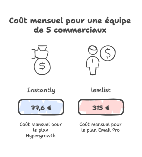 La différence de structure tarifaire est importante. Instantly facture au compte, avec un nombre illimité d'utilisateurs et de boîtes email. lemlist facture par utilisateur, ce qui fait grimper la facture dès que l'équipe s'agrandit. Pour une équipe de 5 commerciaux, lemlist peut coûter entre 315 € et 435 € par mois, contre 77,6 € chez Instantly.