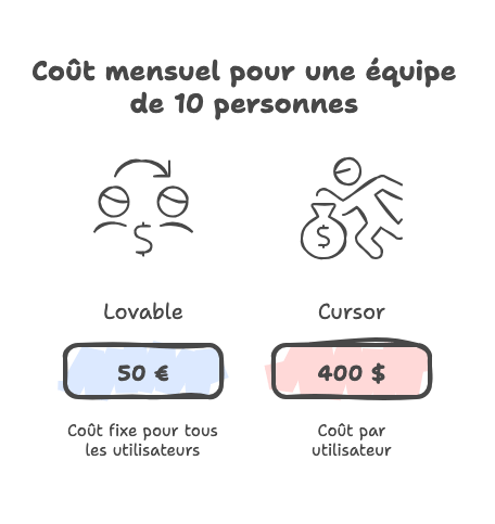 pour une petite équipe (3 à 5 personnes), Cursor reste compétitif. Dès que l'équipe atteint 10 utilisateurs ou plus, le modèle de Lovable devient nettement plus avantageux. L'arbitrage ne se fait donc pas uniquement sur le prix d'entrée, mais sur la projection à moyen terme.