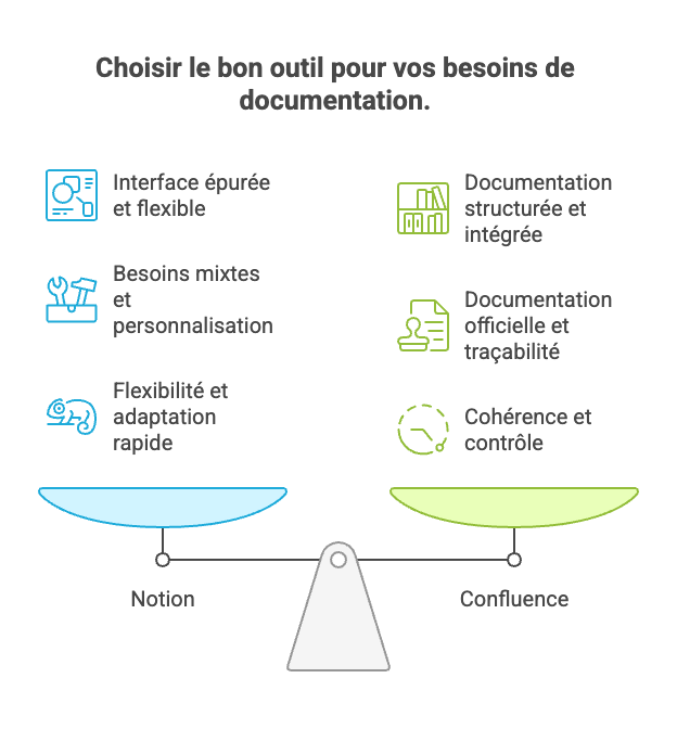 Notion = flexibilité et simplicité pour organiser tout type de contenu ; Confluence = rigueur et intégration pour la documentation d'entreprise.