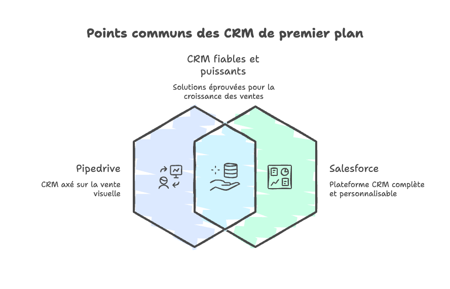 Avant d'explorer leurs différences, il est utile de rappeler ce que Pipedrive et Salesforce partagent. Ces points communs expliquent pourquoi les deux figurent parmi les CRM les plus utilisés par les équipes commerciales.