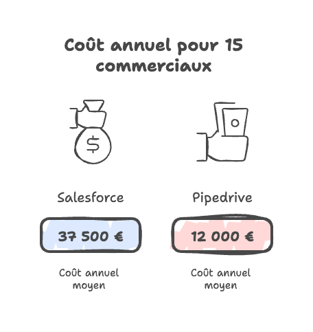 Pour une équipe de 15 commerciaux, Pipedrive représente un investissement annuel compris entre 10 000 et 14 000 € selon le plan. Avec Salesforce, selon les fonctionnalités activées, le budget peut facilement atteindre 25 000 à 50 000 €, voire davantage si vous ajoutez des modules premium. L'écart n'est pas anecdotique.