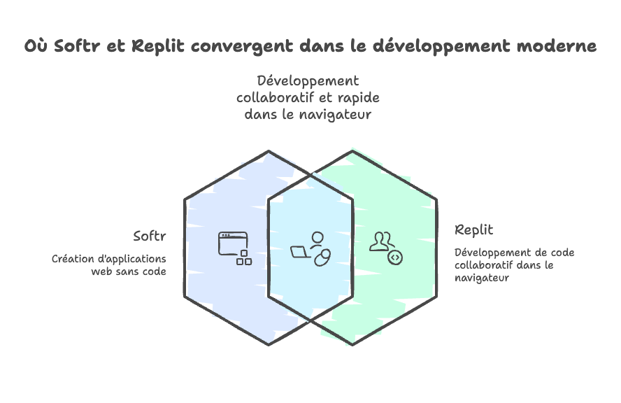 Softr est une plateforme no-code axée sur la création rapide de sites web, portails clients et outils internes à partir de sources de données (Airtable, Google Sheets, etc.). Replit est un environnement de développement en ligne (IDE) qui permet d'écrire, exécuter et déployer du code dans de nombreux langages. En résumé : Softr privilégie la simplicité et la vitesse pour les non-développeurs, Replit offre une flexibilité totale pour les développeurs.