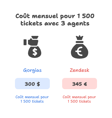 Pour une petite équipe qui gère un volume modéré, Gorgias peut être nettement plus économique. Une PME avec 3 agents et 1 500 tickets par mois paiera environ 345 € par mois chez Zendesk (Suite Professional), contre 300 $ chez Gorgias (plan Pro).
