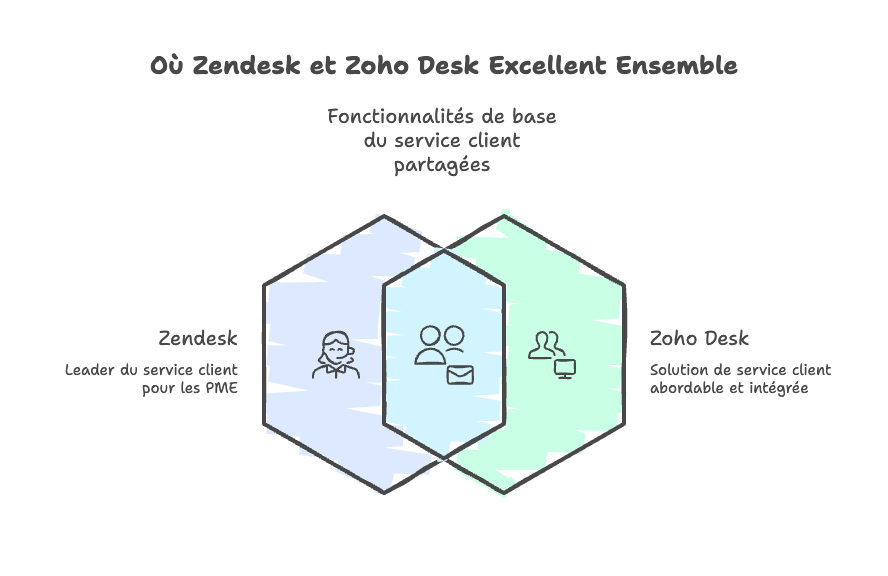 Avant de regarder ce qui les distingue, il est utile de rappeler ce que ces deux outils partagent. Ces points communs expliquent pourquoi Zendesk et Zoho Desk sont considérés comme des références en matière de service client pour les PME.