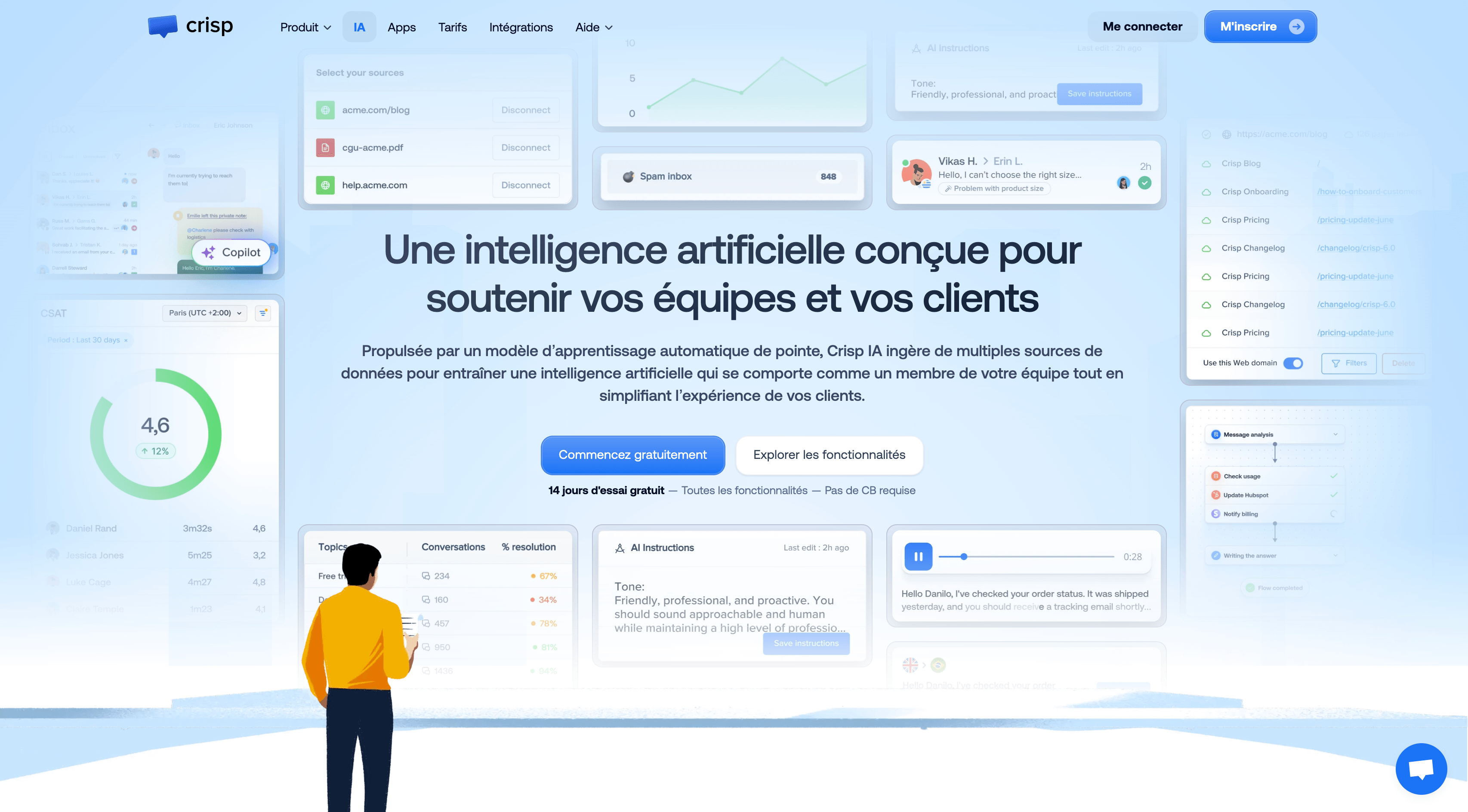 Le chatbot, alimenté par Crisp AI, s’intègre parfaitement à cet environnement. Voici un démonstration en vidéo :