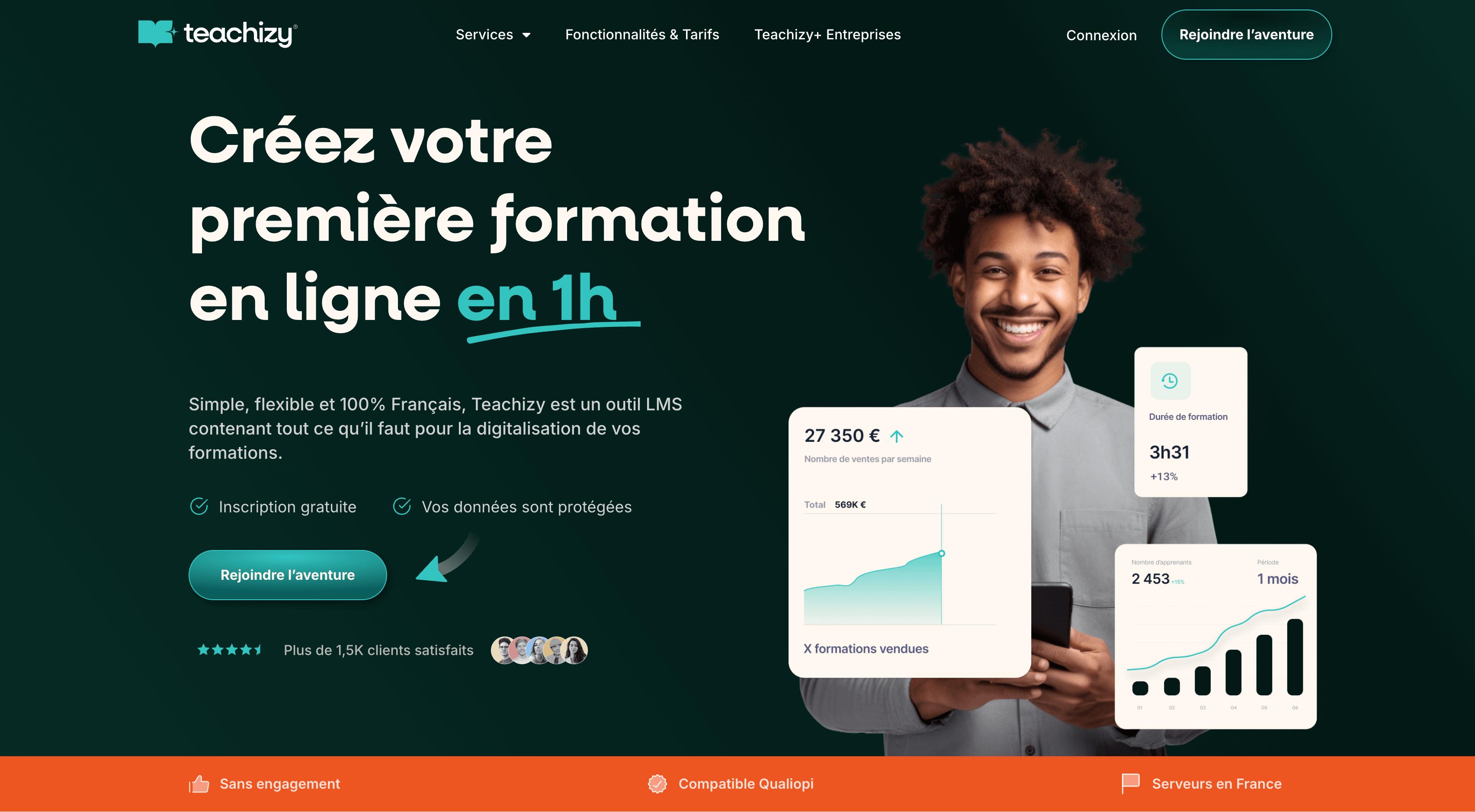 ✅ Teachizy : plateforme française orientée pédagogie et conformité (RGPD, TVA), pensée pour les formateurs et organismes souhaitant offrir un suivi sérieux à leurs apprenants.
