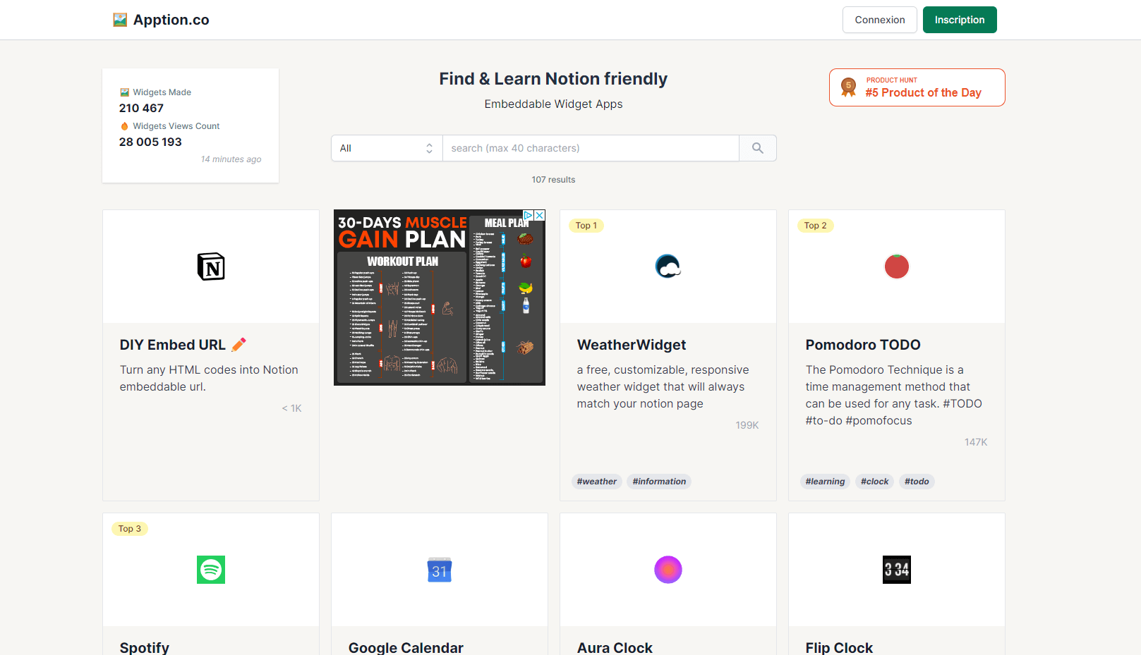 Un top 3 des applications Widget est régulièrement mis à jour pour identifier les applications les plus téléchargées du moment. La bibliothèque est très complète et permet de retrouver un nombre important de modules pour maximiser sa productivité sur Notion. Sur Apption, les widgets sont personnalisables comme le fait de pouvoir modifier leur couleur.